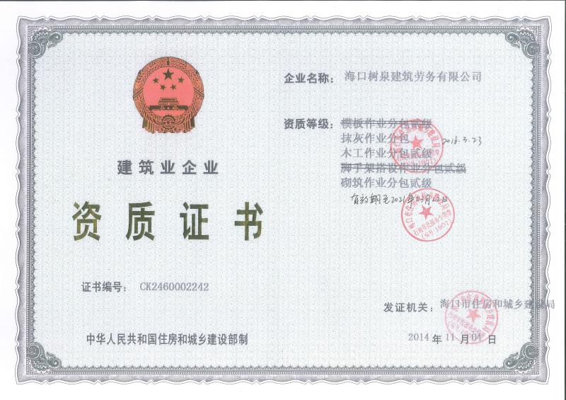 海口樹泉建筑勞務有限公司成立于2011年,公司位于海口,其前身是一家專業(yè)建筑施工隊,自2004年即開始在海南從事建筑勞務施工。自成立至今,公司已經(jīng)擁有一支科學管理、質(zhì)量過硬、能打硬仗,搶工期的專業(yè)隊伍。能獨立承擔大中型工業(yè)與民用建筑 、室內(nèi)外裝修、各類機電設(shè)備安裝工程。代表工程有海口濱海華庭、三亞時代海岸T01/02/04/05棟高層、合肥東海花園二期、陵水富力灣B區(qū)高層、三亞金中海(酒店)、瓊海大印經(jīng)典花園、海口環(huán)球海景大酒店(四星級酒店,在建中)、陵水珍珠大廈(五星酒店)、海口萬達廣場、美蘭機場二期。